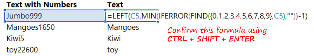 Excel how to separate text from numbers. In the example shown the formula in c5 is. To split text and numbers you can use a formula based on the find function the min function and the len function with the left or right function depending on whether you want to extract the text or the number. And if you want to extract only numbers within string then you also need to right function to combine with the above functions.