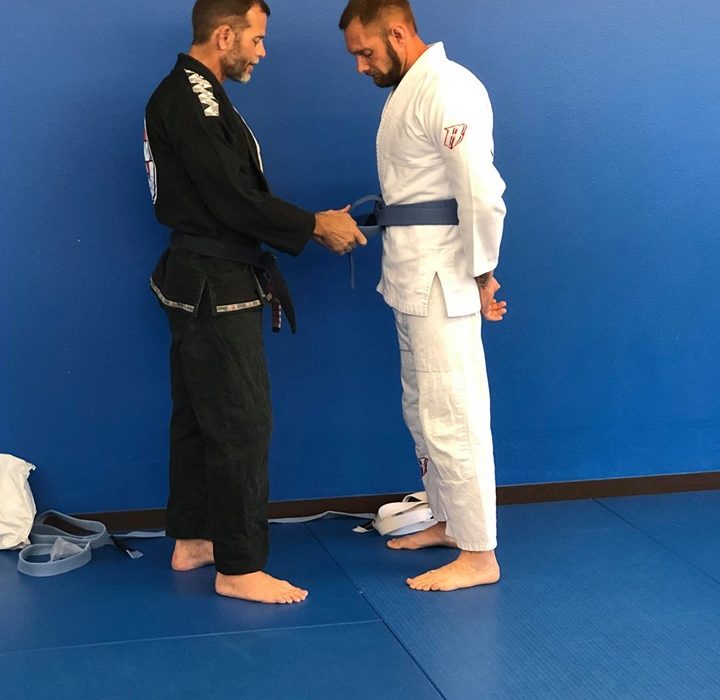 White to blue belt. For blue belt minimum time athlete has to spend in the blue belt is 2 years. Get used to the feeling of jiu jitsu.