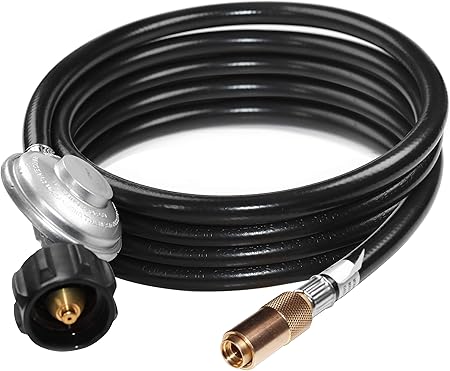 Make sure all of the control knobs on the grill are in the off position. Just get a century 8 foot hose with type 1 coupling. Connect the grills gas line to the propane tanks nozzle.