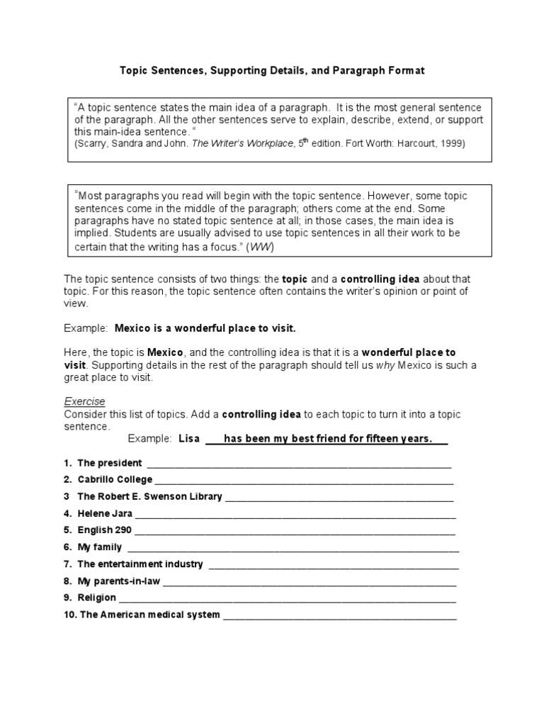 Generally the topic sentence appears at the beginning of the paragraph. What follows a topic sentence are a number of supporting sentences that develop the main idea with specific details. A topic sentence or topic sentences come at the start of each body paragraph topic sentences need to transition from previous paragraphs show a link to the thesis statement and introduce the main idea of the current paragraph you can use signposting to improve the logical flow of your paragraphs.