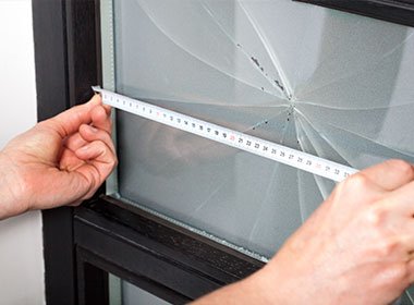 Check the broken glass. Plywood fastened just to trim or sheathing can go flying. Use a circular saw to cut the plywood to match the height.