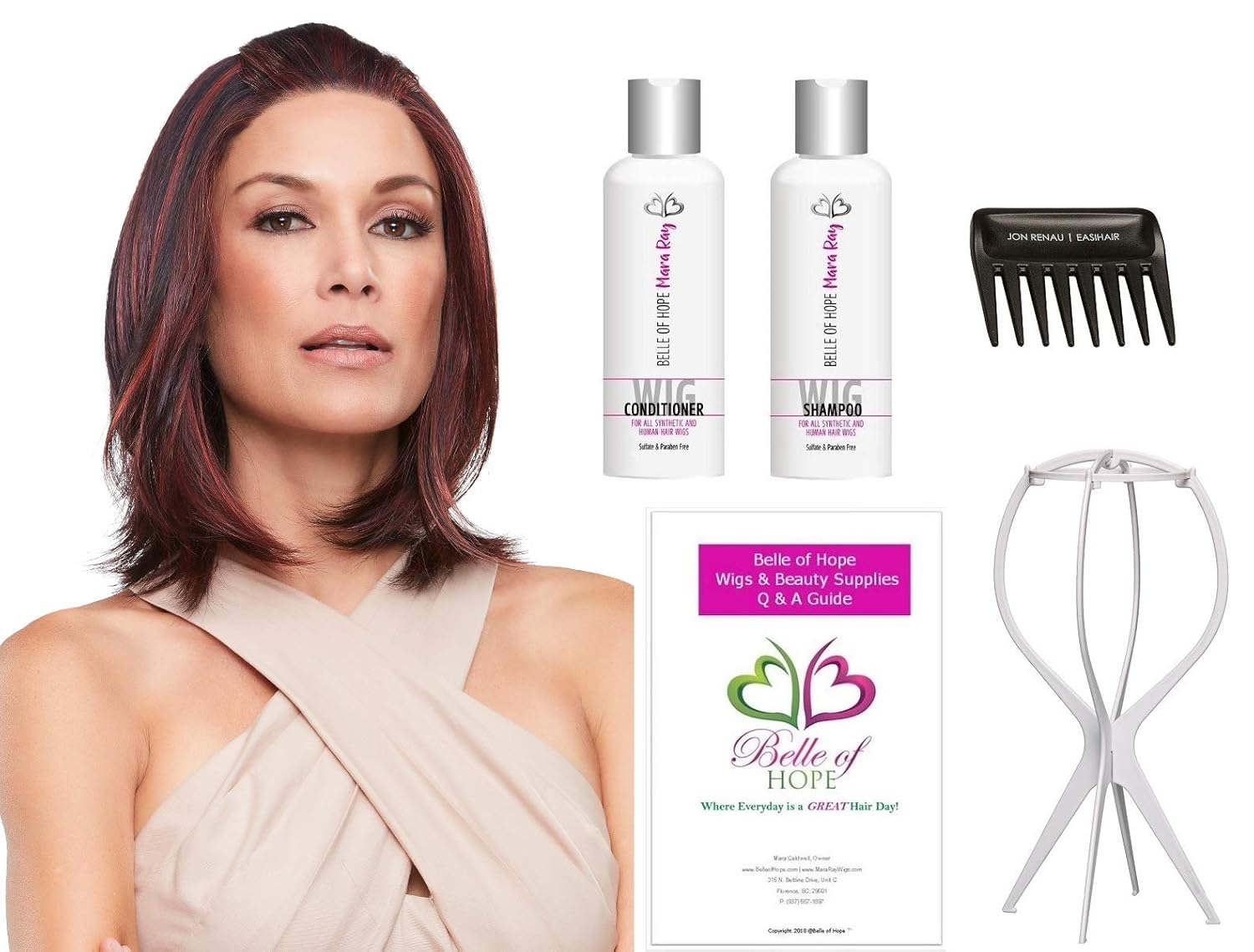 A wide tooth comb duckbill clips straight pins a styrofoam head wig conditioner. To use a hot air brush on a synthetic wig be sure that the brush is on its lowest setting.