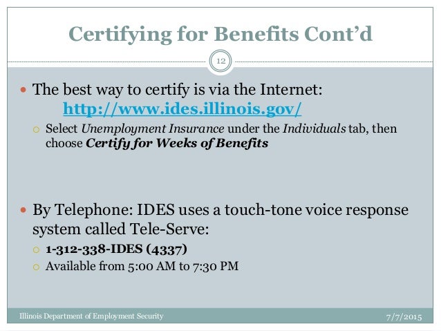 How to certify for illinois unemployment. 312 338 4337 500 am. The best way to complete your certification is online from 300am 730pm on your designated certification day or on thursdays or fridays including holidays. You can certify for benefits online at httpwwwidesillinoisgovpagescertifyweeklybenefitsaspx.