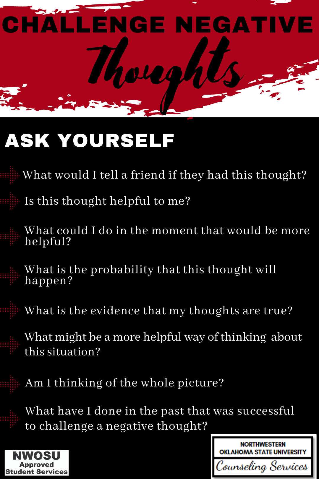 Am i falling into a thinking trap eg catastrophizing or overestimating danger. Challenge negative thinking questions to ask yourself to help challenge your negative thoughts or self talk. Negative thought negative feelingction.