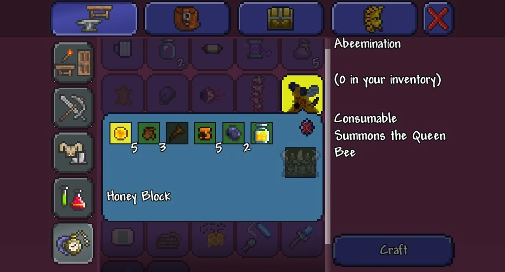 It is a material in creating an abeemination which will summon the queen bee. 1 crafting 11 recipes 12 used in 2 see also 3 history waterfall block lavafall block snowfall block sandfall block desktop 132sprite updated.