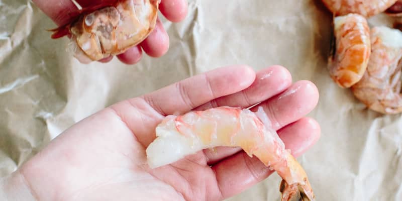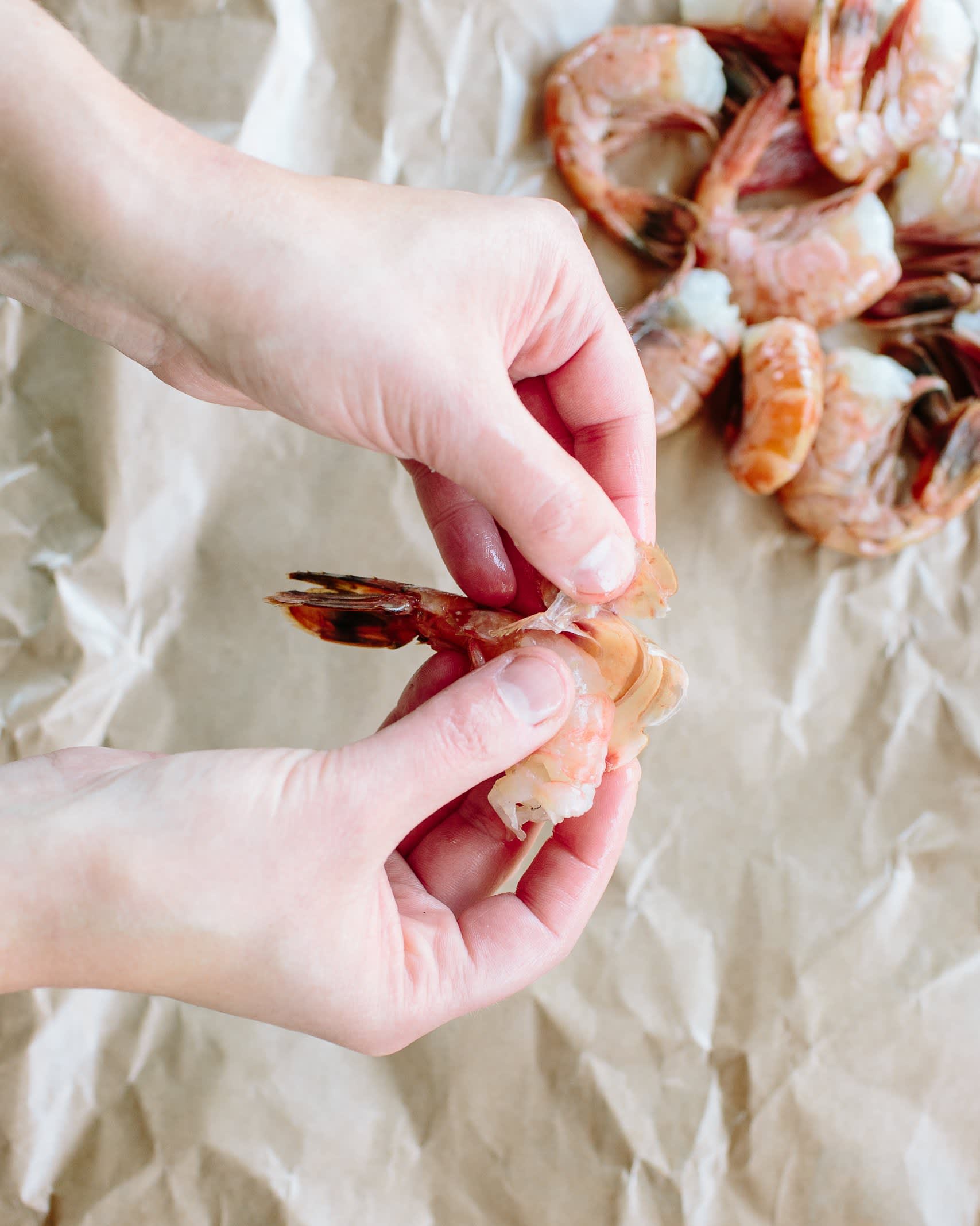 Peeling shrimp by hand pull off the legs. Peeling and deveining shrimp yourself both saves you money and is much fresher and more delicious to the pre peeled shrimp. Shrimp are invertebrates with their skeletons consisting of a polymer called chitin on the outside of their bodies.