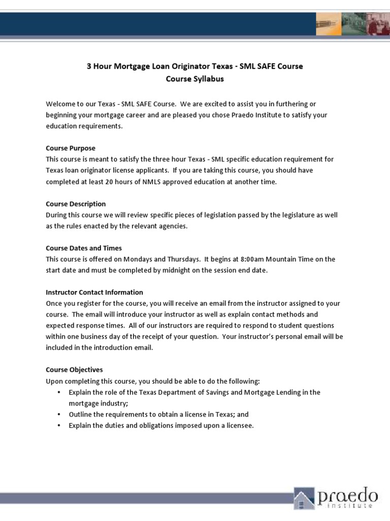 Aspiring brokers need to complete a pre licensure program a 20 hour. Most residential mortgage loan originators rmlo in texas have to undergo a licensing procedure with the department of savings and mortgage lending. Additionally three of those 23 hours must be texas specific.