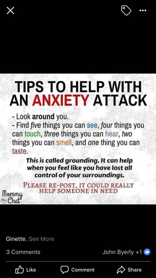 If you know what causes your friends attacks dont help them. Stand barefoot in the grassdirtcarpet. Increase self awareness of what triggers your anxiety this way you can tackle it from a better angle and anticipate.