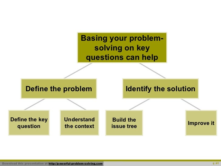 Select the best course of action. Identify and define the problem. This page continues from problem solving an introduction that introduces problem solving as a concept and outlines the stages used to successfully solve problems.